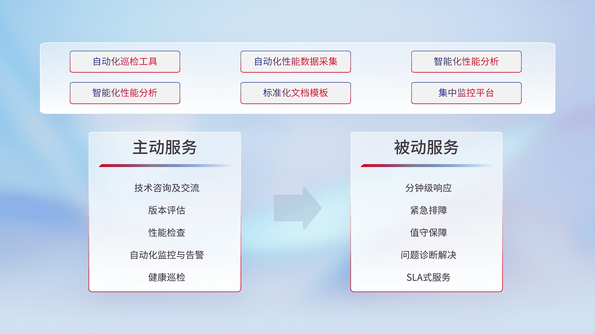 智能化工具和标准化文档,,保障服务质量,,,提供主动服务(包含技术咨询、、、版本评估、、、、性能检查、、、、自动化监控与告警、、、健康巡检)和被动服务包含(分钟级响应、、、、紧急排障、、值守保障、、问题诊断解决、、、SLA服务)。。。